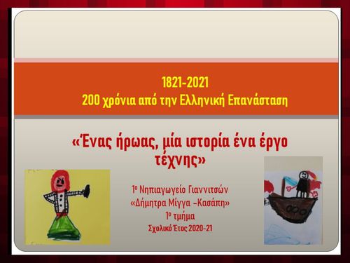 Στο παρακάτω ψηφιακό βιβλίο θα διαβάσετε μία ιστορία που δημιουργήθηκε από την φαντασία των παιδιών. Οι μαθητές και οι μαθήτριες του 1ου τμήματος Β.Υ.Π. και Π.Ο.Π. του νηπιαγωγείου μας με όλα όσα αποκόμισαν από την πραγματοποίηση δραστηριοτήτων για τους ήρωες που επέλεξαν να επεξεργαστούν στα πλαίσια του πολιτιστικού προγράμματος " Ένας ήρωας , μία ιστορία, ένα έργο τέχνης" με αφορμή τα 200 χρόνια από την Ελληνική Επανάσταση δημιούργησαν μία ιστορία για μία πιθανή συνάντηση των δύο ηρώων. Η συνάντηση αυτή είναι δημιούργημα των παιδιών καθώς δεν βρέθηκε κάποια σχετική πληροφορία στην επίσημη βιβλιογραφία. Πατήστε πάνω στην έκφραση " Όταν η Μπουμπουλίνα συνάντησε τον Κανάρη" για να περιηγηθείτε στο ψηφιακό βιβλίο και να δείτε την ιστορία που δημιούργησαν τα παιδιά καθώς και την ανάλογη εικονογράφηση.